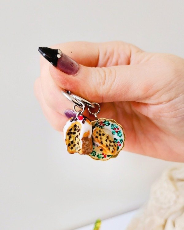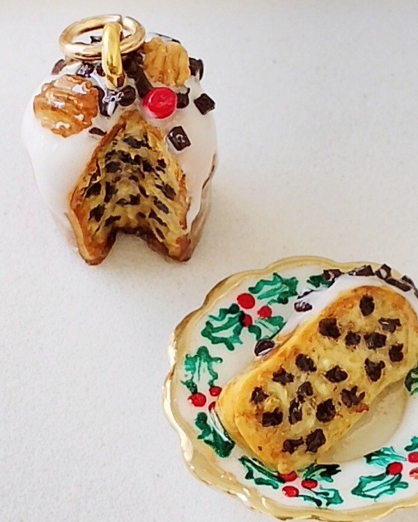 Material: pan dulce en porcelana fría , platito de resina epoxi, pintado a mano con detalle dorado. Barnizado con laca poliuretánica. No exponerlos al agua, solventes o perfume.